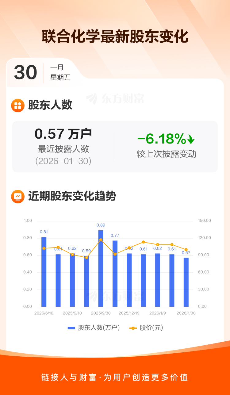 联合化学最新披露数据显示,截至1月30日公司股东户数为5708户,较上期(2026年1月20日)减少376户,降幅为6.18%。户均持有流通股数量由上期的1.57万股上升至1.68万股,户均持股金额由上期的170.67万元减少至167.13万元。