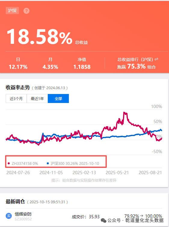 10月15日,3个交易日总收益来到18%(数据第三方来源:雪球---乾道量化量化实盘)。