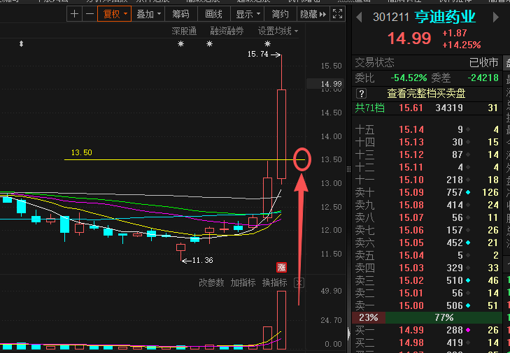 这票里画线的位置太远,除非大盘特别差,否则一天不好到达到13.50左右,所以用一两天回踩就完美了
