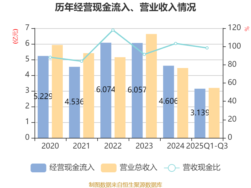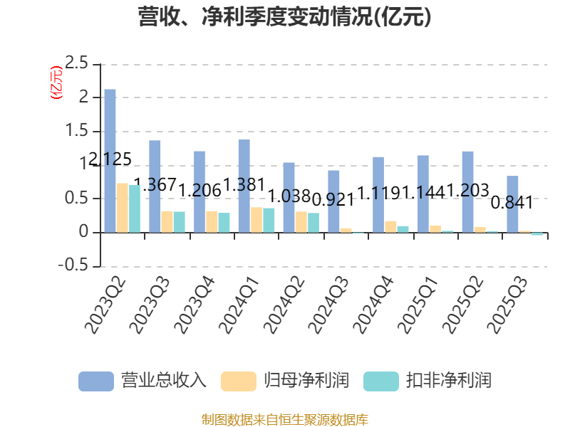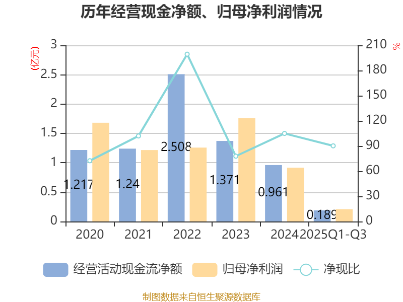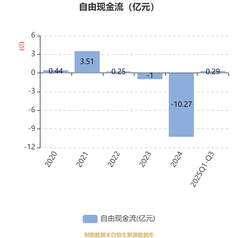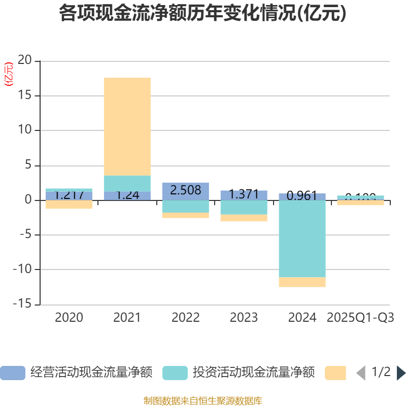 2025年前三季度,公司经营活动现金流净额为1887.03万元,同比下降61.46%;筹资活动现金流净额-7281.57万元,同比增加6542.43万元;投资活动现金流净额4674.76万元,上年同期为-10.85亿元。