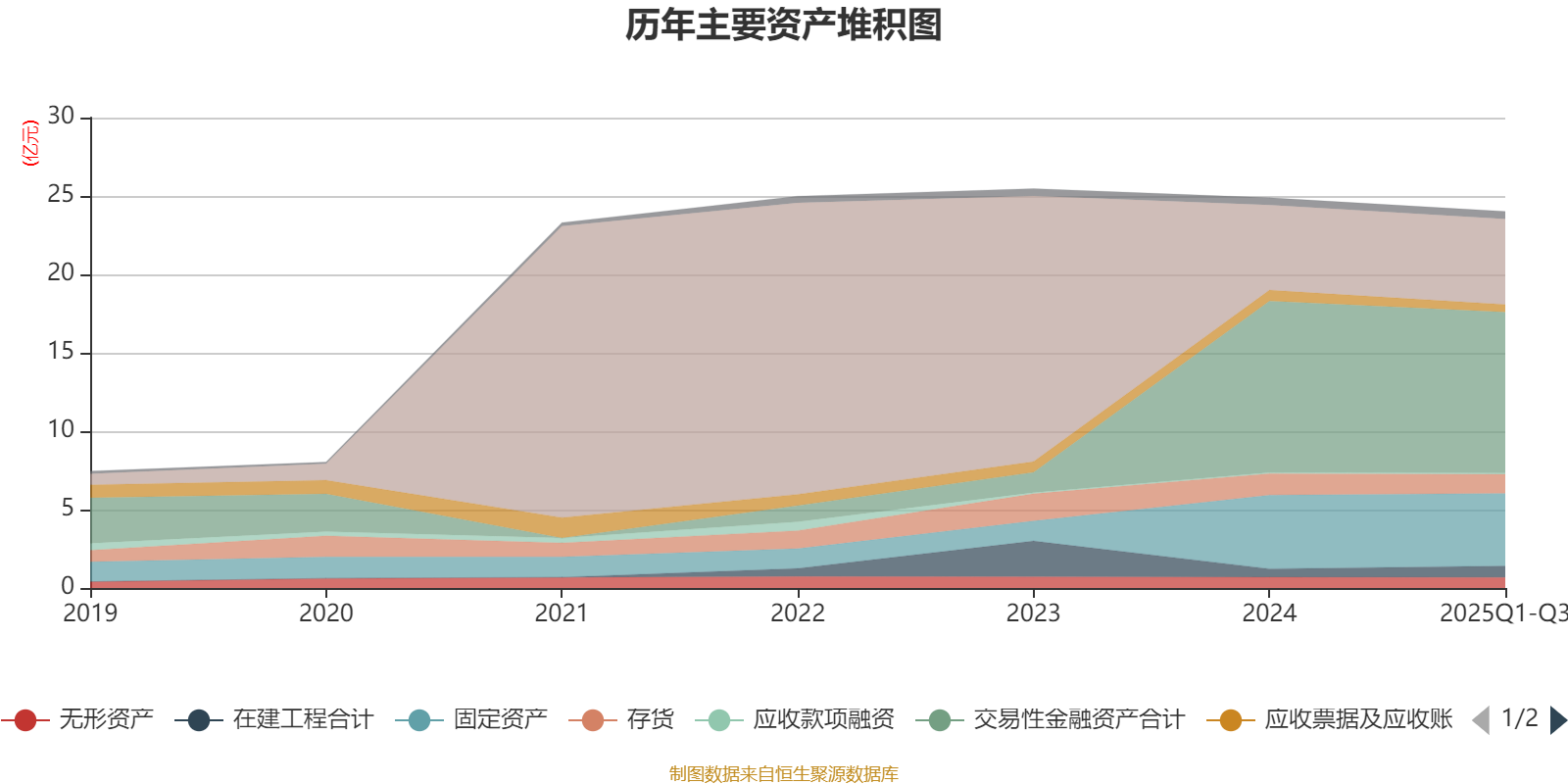 资产重大变化方面,截至2025年三季度末,公司交易性金融资产合计较上年末减少6.2%,占公司总资产比重下降1.23个百分点;在建工程合计较上年末增加37.19%,占公司总资产比重上升0.91个百分点;货币资金较上年末增加0.27%,占公司总资产比重上升0.85个百分点;应收票据及应收账款较上年末减少28.95%,占公司总资产比重下降0.73个百分点。