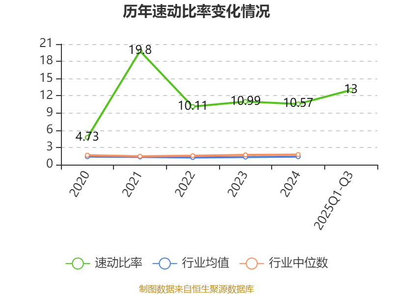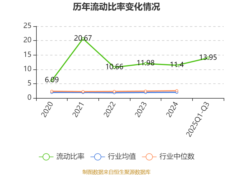 2025年前三季度,公司流动比率为13.95,速动比率为13。