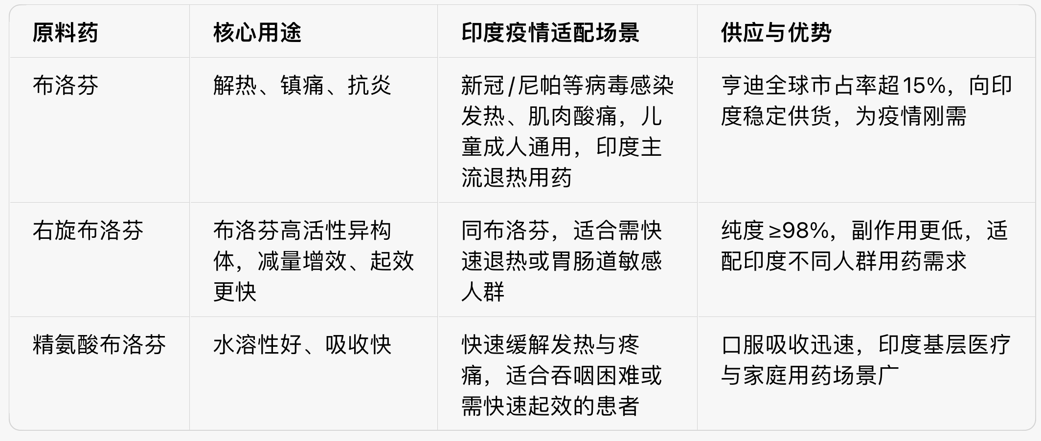 供应优势:亨迪布洛芬原料药产能与全球供应能力强,可快速响应印度疫情期间的退热用药需求。