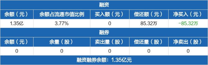 融资方面,当日融资买入0元,融资偿还85.32万元,融资净偿还85.32万元,连续9日净偿还累计2172.42万元。融券方面,融券卖出0股,融券偿还0股,融券余量0股,融券余额0元。融资融券余额合计1.35亿元。