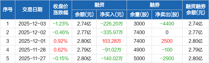 融资方面,当日融资买入469.22万元,融资偿还695.43万元,融资净偿还226.2万元。融券方面,融券卖出0股,融券偿还4400股,融券余量3000股,融券余额1.94万元。融资融券余额合计2.74亿元。