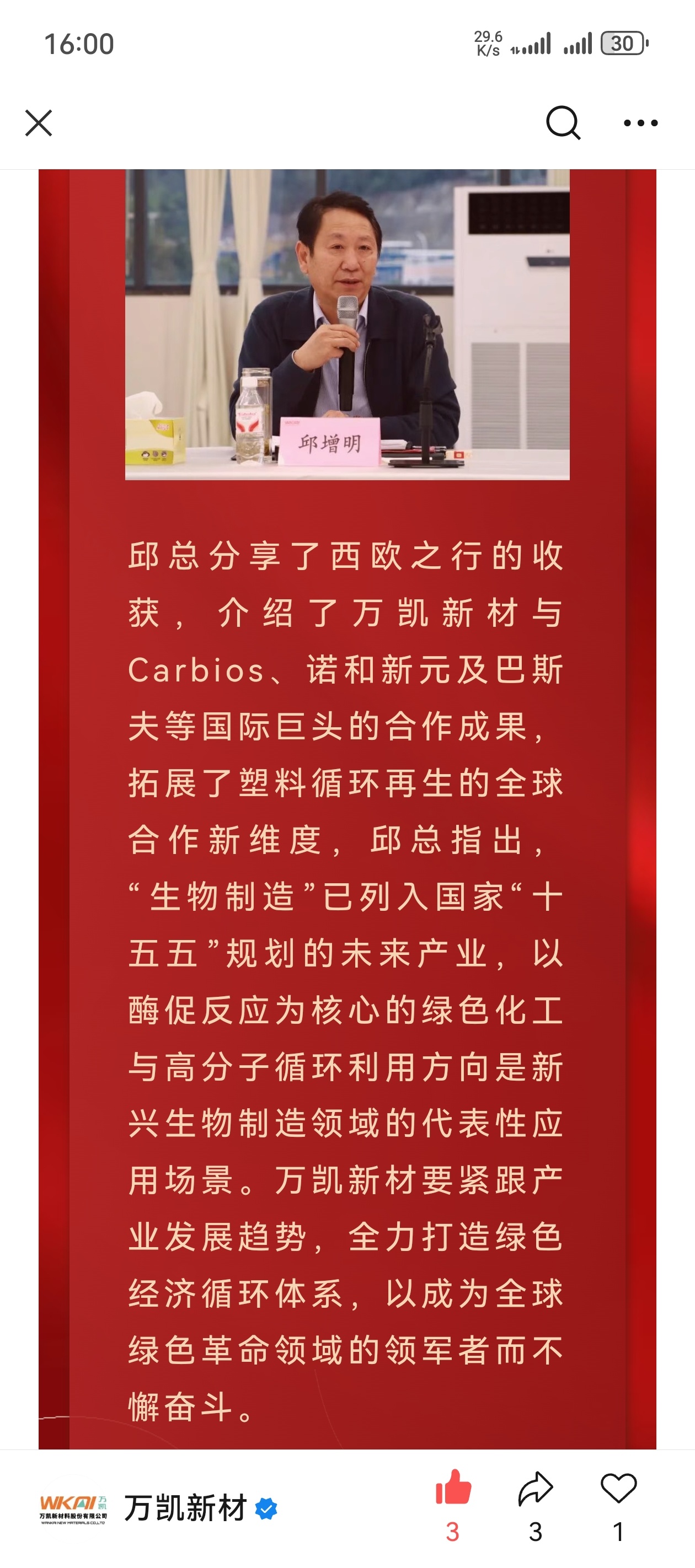 $万凯新材(SZ301216)$ 生物制造,具身智能,先进材料三驾齐驱。
