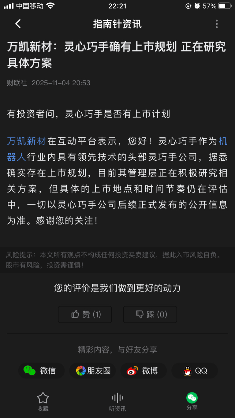 $万凯新材(SZ301216)$ 灵巧手要上市随时启动