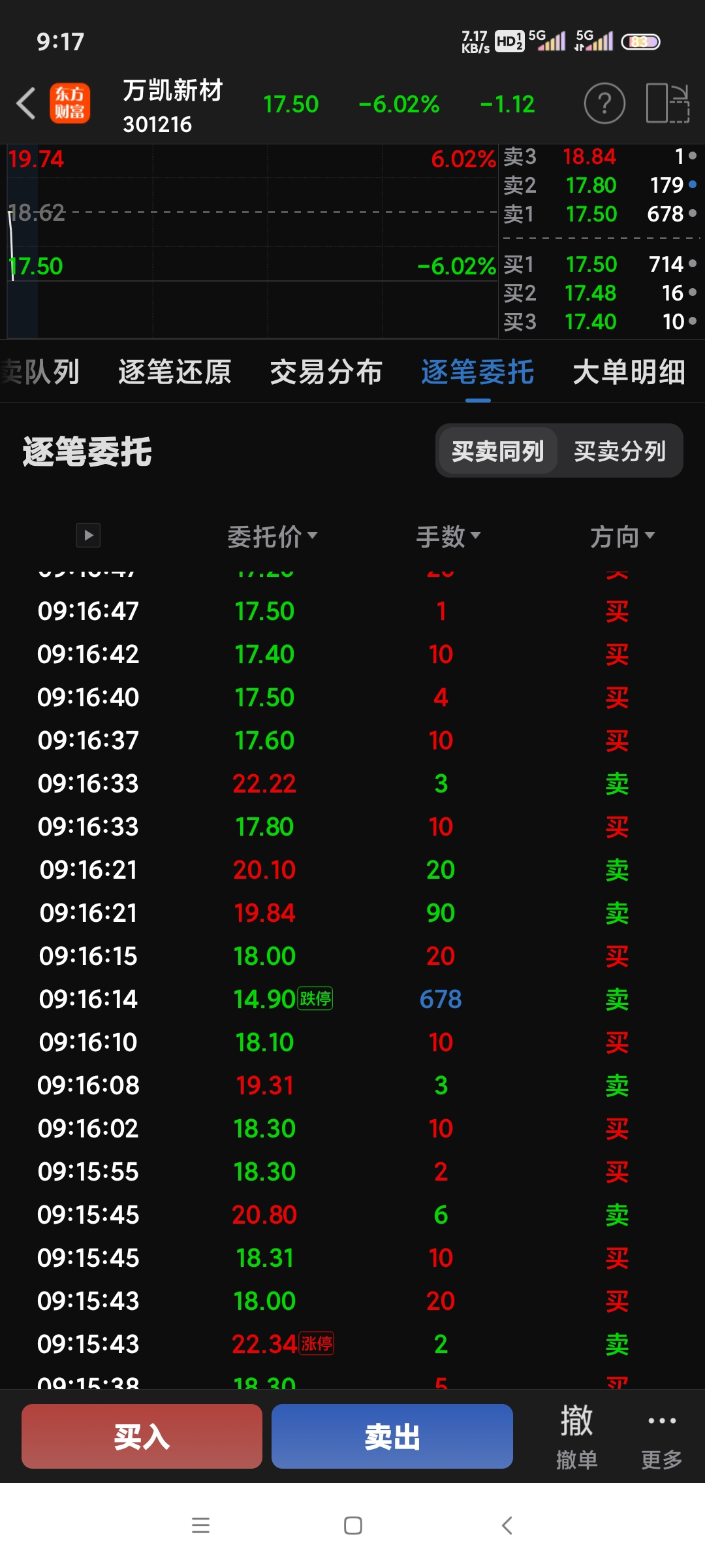 $万凯新材(SZ301216)$ 每天都有一笔678手挂跌停价,再撤单!