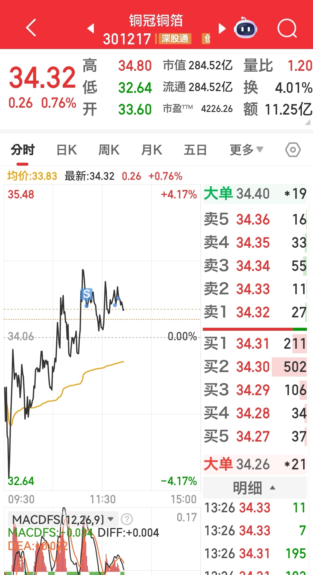 今天11月14日下午,开始本周第一次操作:$铜冠铜箔(SZ301217)$ 开始盈利,在34.36元和34.42元减仓;280元开始T回11月3日294.14元减仓的$胜宏科技(SZ300476)$ ;$生益科技(SH600183)$ 在57.33元和57.26元补仓。