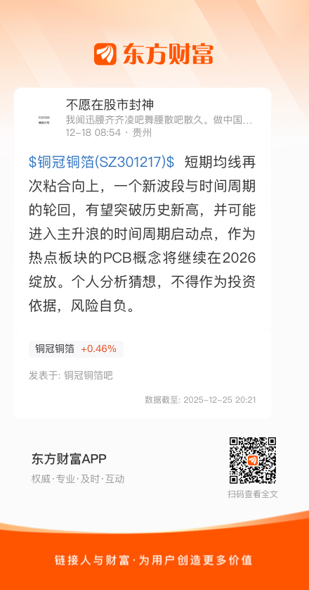 $铜冠铜箔(SZ301217)$ 短期均线再次粘合向上,一个新波段与时间周期的轮回,有望突破历史新高,并可能进入主升浪的时间周期启动点,作为热点板块的PCB概念将继续在2026绽放。个人分析猜想,不得作为投资依据,风险自负。