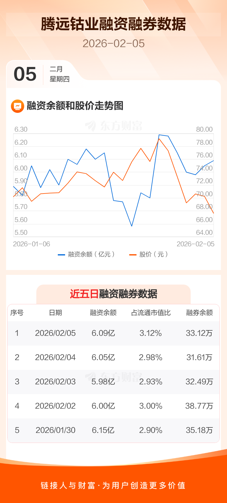 交易所最新数据显示,腾远钴业于2026年2月5日获融资买入4229.77万元,融资偿还3781.02万元,当日融资净买入448.76万元。目前,该股融资余额6.09亿,占流通市值比例为3.12%。