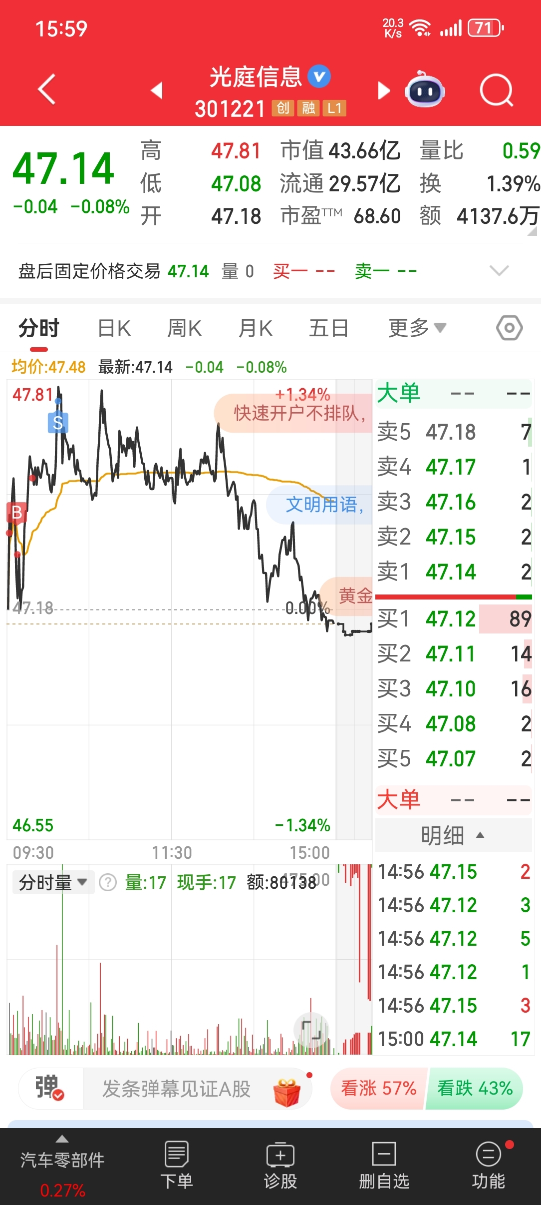 $光庭信息(SZ301221)$ 被套的无力吐槽了,今又T了个寂寞,太弱了没法T,虽然今不亏,主力不干活,累死小散。