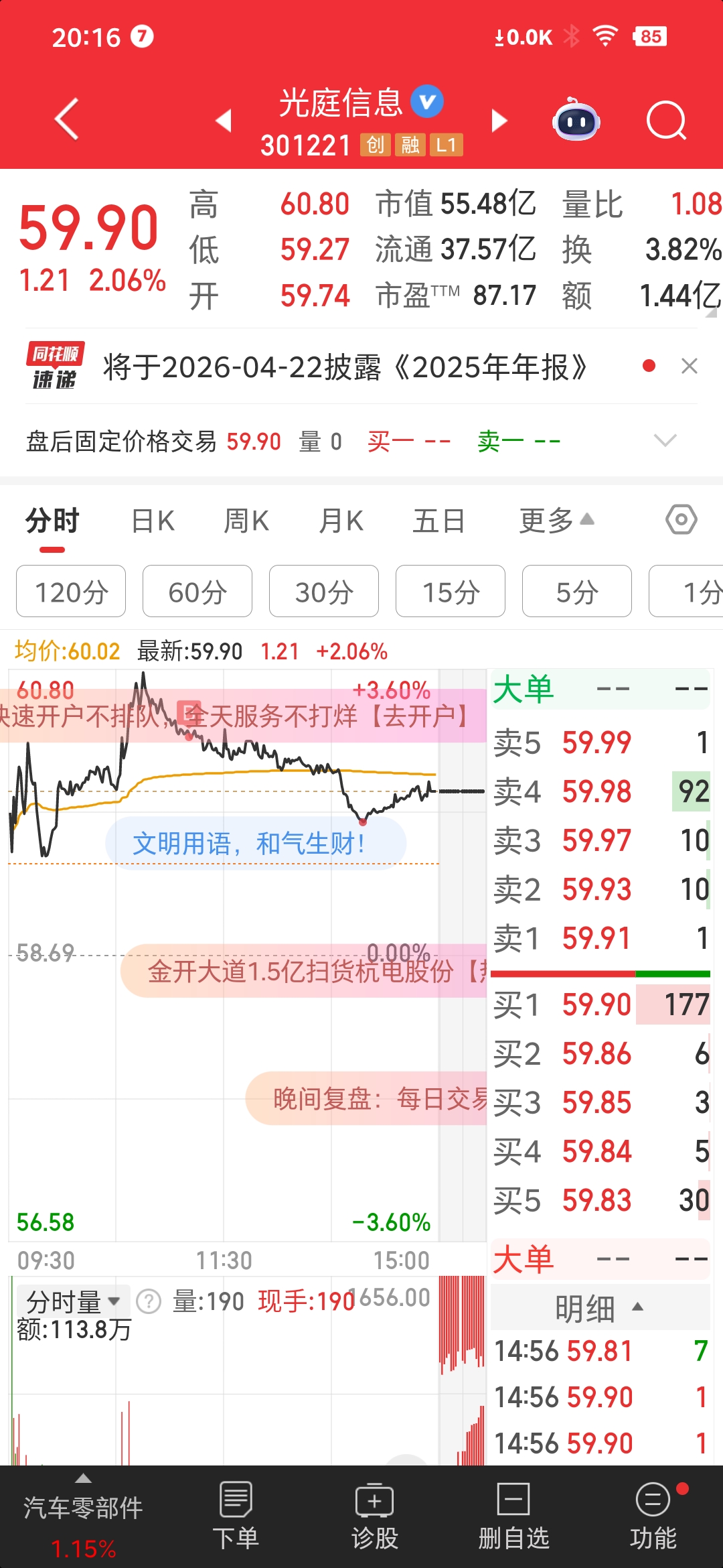 $光庭信息(SZ301221)$ 持有这么久来第一次追高,好像也还没亏多少,也是光庭近八天站在所有均线之上收盘之日,能走出上升之势吗?不知,但能站在均线之上,给人总得有念想,都说线下不做多,线上依势操作,不知对错?