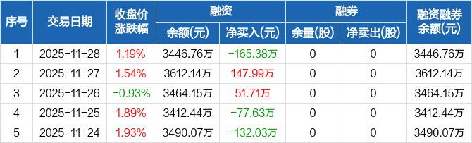 中荣股份:融资净偿还165.38万元,融资余额3446.76万元(11-28)