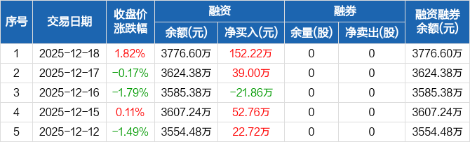中荣股份:融资净买入152.22万元,融资余额3776.6万元(12-18)