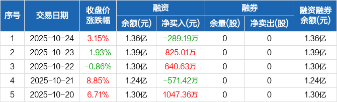 恒勃股份:融资净偿还289.19万元,融资余额1.36亿元(10-24)