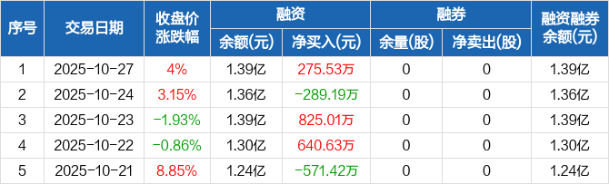 恒勃股份:融资净买入275.53万元,融资余额1.39亿元(10-27)