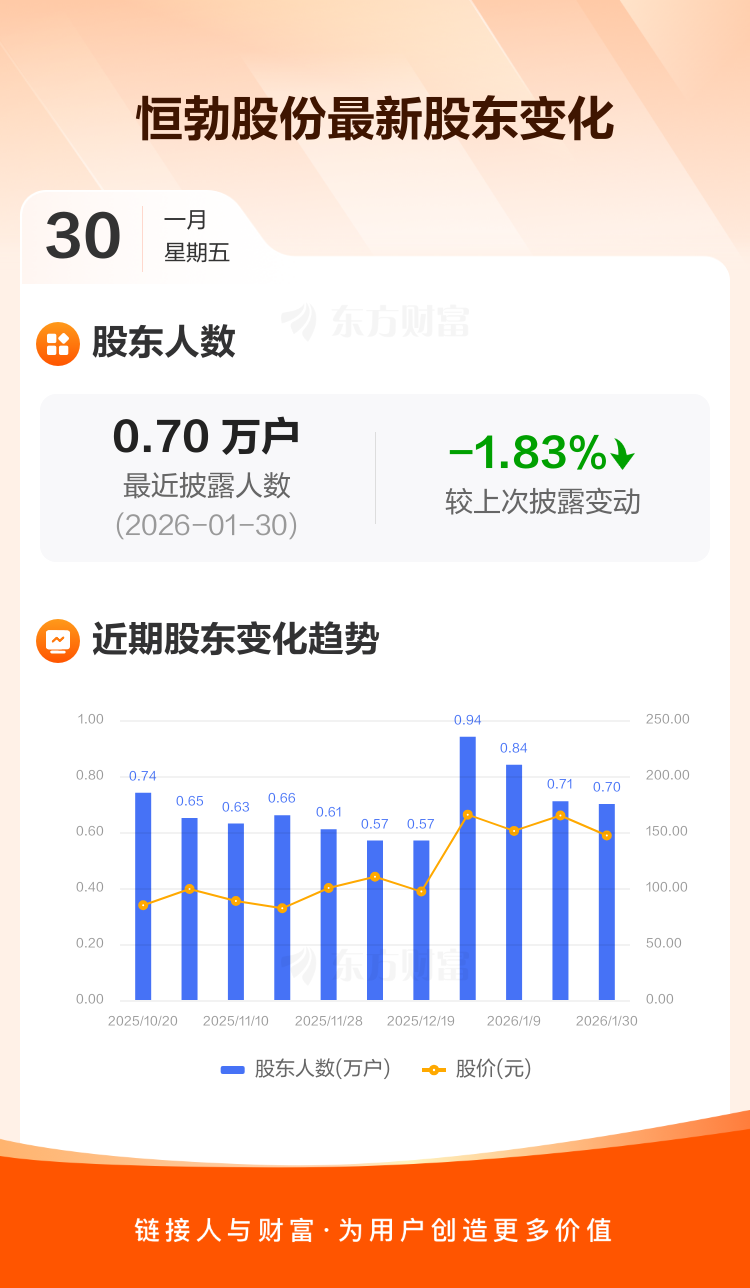 恒勃股份最新披露数据显示,截至1月30日公司股东户数为6970户,较上期(2026年1月20日)减少130户,降幅为1.83%。户均持有流通股数量由上期的4208股上升至4287股,户均持股金额由上期的69.34万元减少至62.96万元。