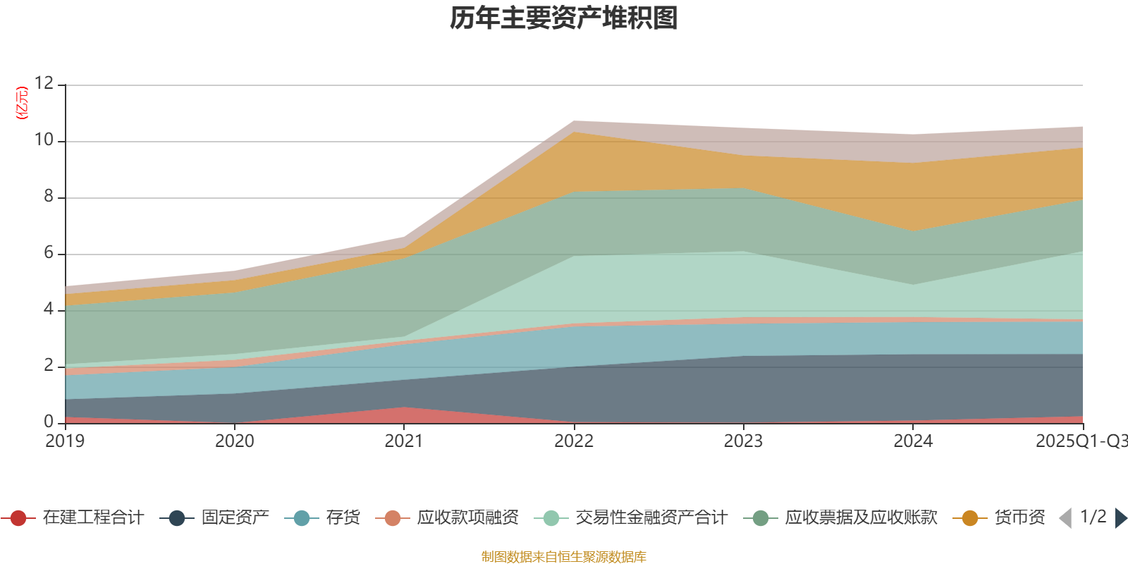 资产重大变化方面,截至2025年三季度末,公司交易性金融资产合计较上年末增加110.65%,占公司总资产比重上升11.76个百分点;货币资金较上年末减少23.48%,占公司总资产比重下降6.04个百分点;一年内到期的非流动资产较上年末减少100%,占公司总资产比重下降3.55个百分点;固定资产较上年末减少6.29%,占公司总资产比重下降2.01个百分点。