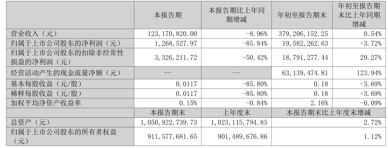 中证智能财讯祥明智能(301226)10月27日披露2025年第三季度报告。前三季度公司实现营业总收入3.79亿元,同比增长0.54%;归母净利润1958.23万元,同比下降3.72%;扣非净利润1879.13万元,同比增长29.27%;经营活动产生的现金流量净额为6313.95万元,同比增长123.94%;报告期内,祥明智能基本每股收益为0.18元,加权平均净资产收益率为2.16%。