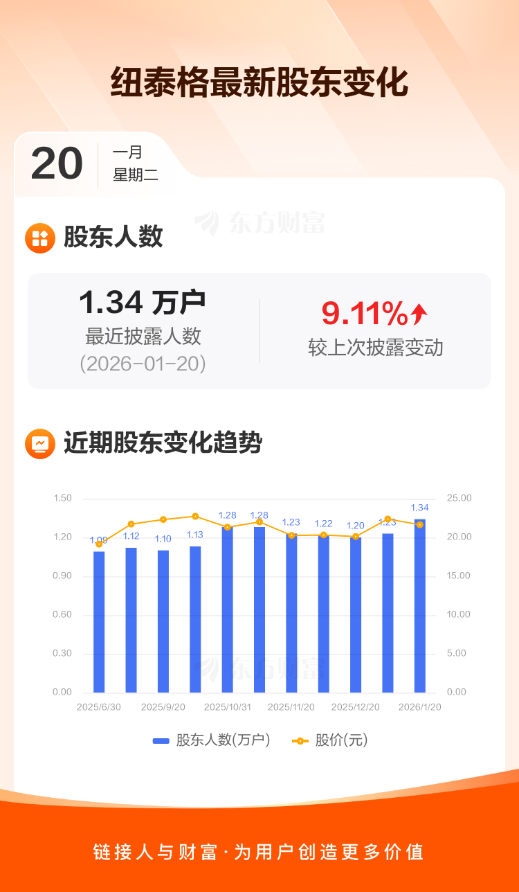 纽泰格最新披露数据显示,截至1月20日公司股东户数为1.34万户,较上期(2026年1月10日)增加1122户,增幅为9.11%。户均持有流通股数量由上期的1.05万股下降至9624股,户均持股金额由上期的23.49万元减少至20.83万元。