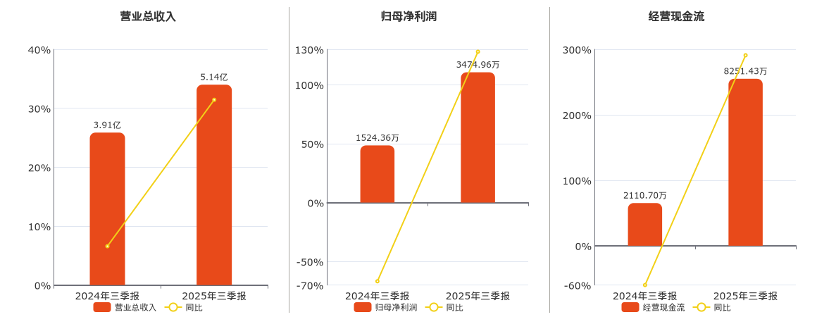 公司营业总收入为5.14亿元,在已披露的同业公司中排名第30。归母净利润为3474.96万元,在已披露的同业公司中排名第22。经营活动现金净流入为8251.43万元,在已披露的同业公司中排名第24。