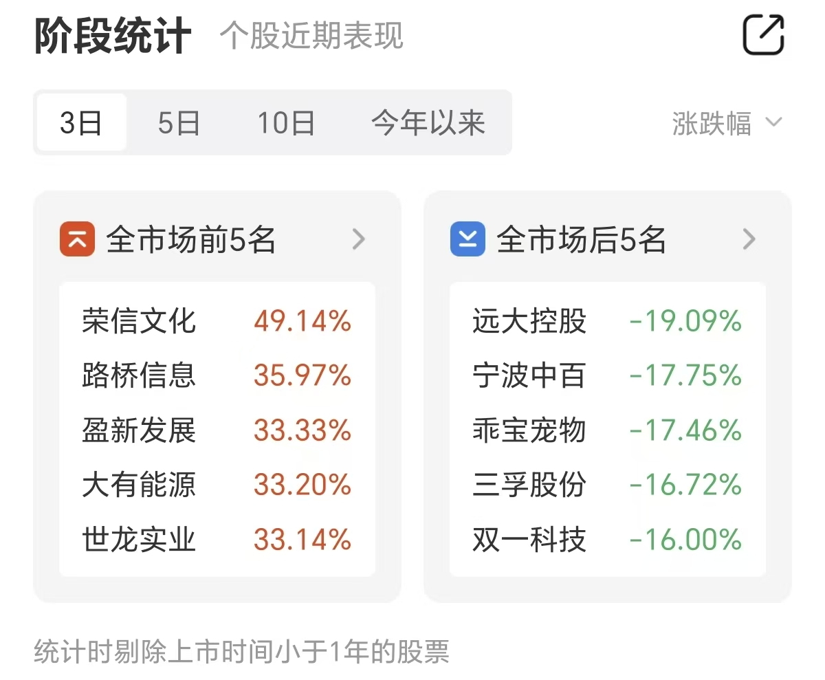 周四市场探底回升,A股全市场涨幅前五名分别为荣信文化、路桥信息、盈新发展、大有能源、世龙实业,其中荣信文化三日涨幅达49.14%,位列涨幅榜第一。