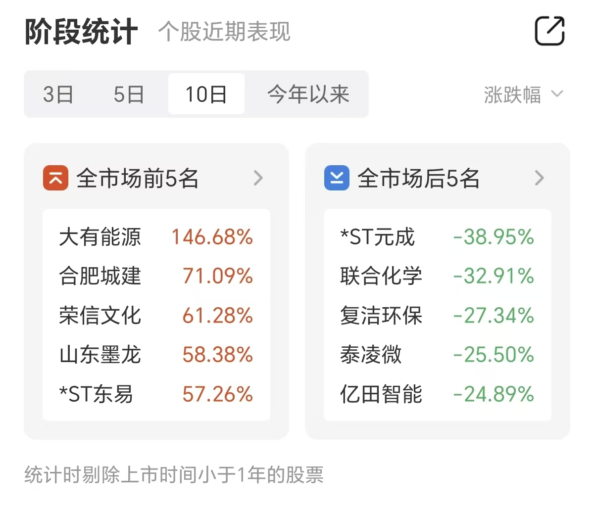 与此同时,近十个交易日涨幅前五名的个股分别为大有能源、合肥城建、荣信文化、山东墨龙、*ST东易。