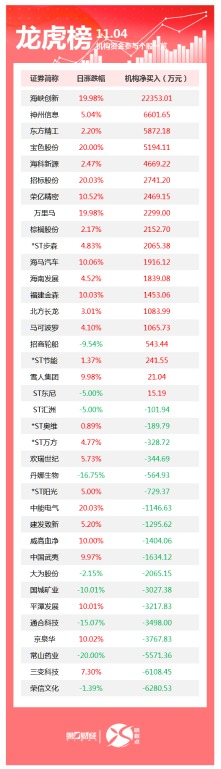 盘后数据显示,11月4日龙虎榜中,共37只个股出现了机构的身影,有19只股票呈现机构净买入,18只股票呈现机构净卖出。