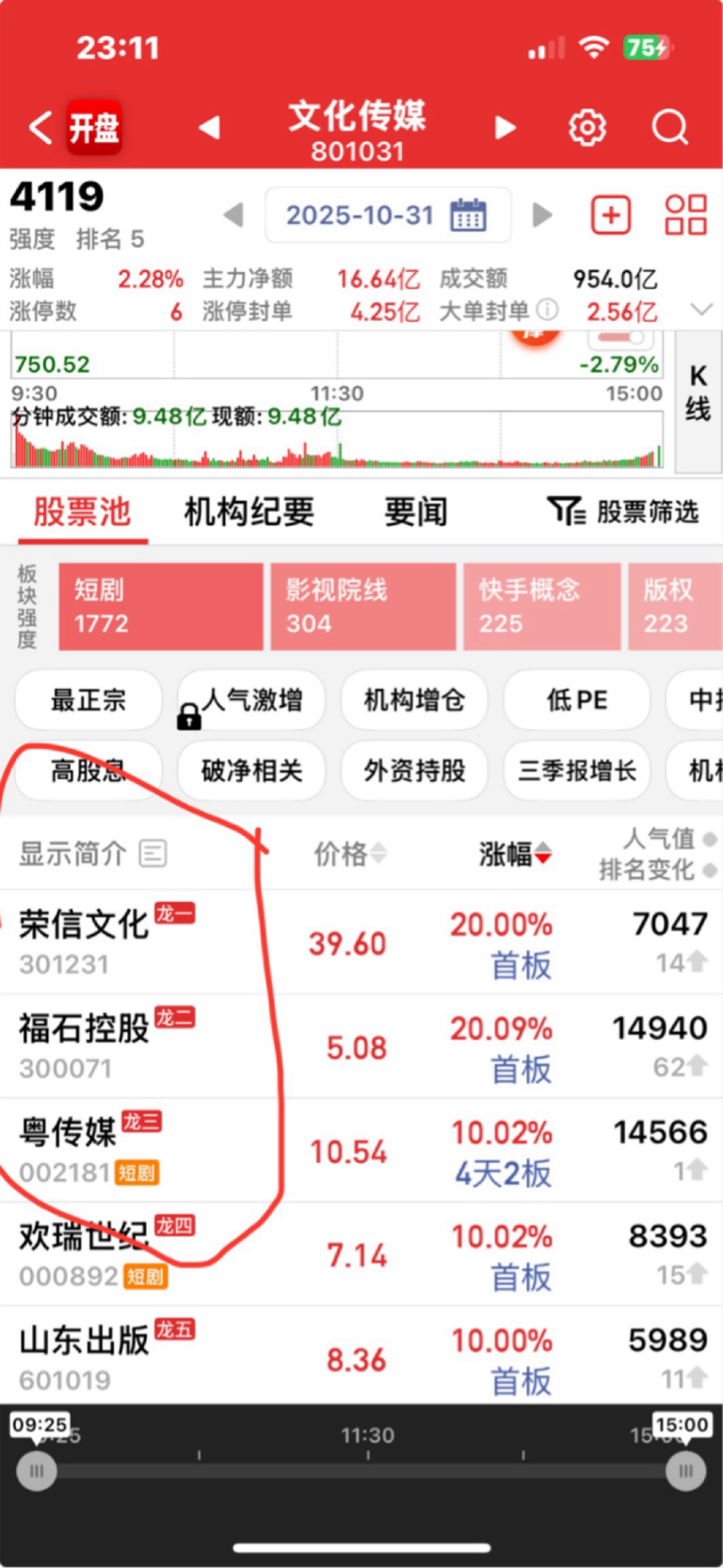$荣信文化(SZ301231)$ 原来死在龙一身上已经四个交易日,上周五市场怎么定位是文化传媒龙头,并且早早涨停,这个软件开盘啦定位龙一地位是错误引导作用,本周一冲42元就大幅回调15%,是龙一?被龙二龙三都超越