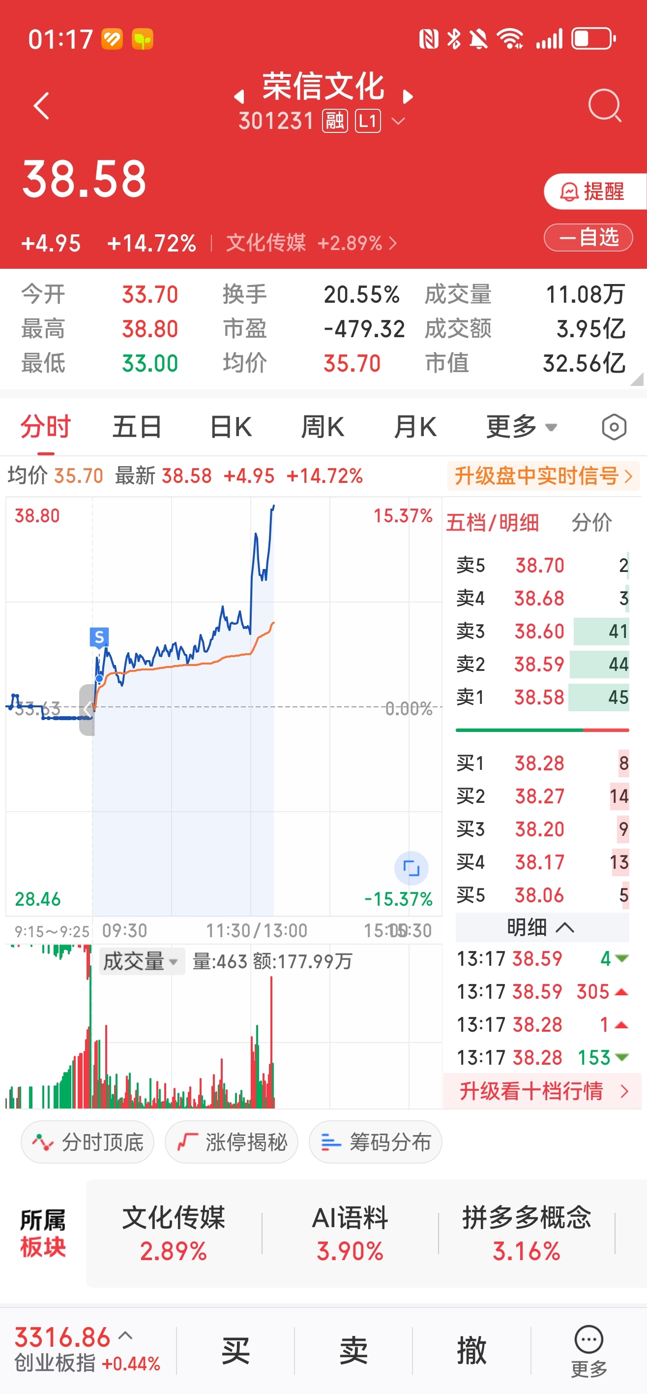 $荣信文化(SZ301231)$ 卖飞了去了大业 结果亏麻了 25个点没了