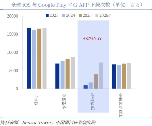 从全球iOS和Google Play平台APP下载次数来看,生成式AI已经成为增长速度最迅猛的一类,反映出生成式 AI 应用在全球范围内的快速普及和用户需求的爆发式增长。