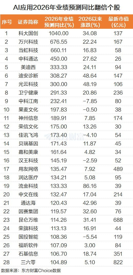 从机构预测的2026年业绩来看,不少AI应用概念股业绩增幅明显。科大国创暂居首位,预计2026年业绩同比增幅达1040%;万兴科技、当虹科技、中科通达、美迪西、迪安诊断、光云科技也排名靠前,2026年业绩同比增幅预计超过300%。