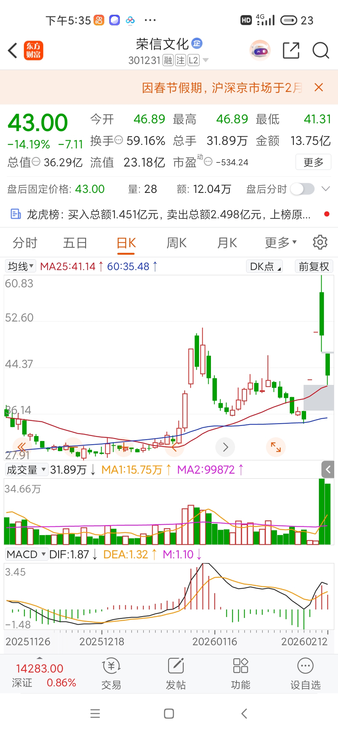 $荣信文化(SZ301231)$ 一字板上去的票居然还有人看龙虎榜,所谓的机构卖出买入看似在做T,实际是庄家诱导散户去接盘,龙虎榜才多少资金,一天的成交额又是多少,有参考意义?这跟一字跌停板上有大资金抄底一个道理,其实也是庄家筹码对倒形成大额成交量,都是诱导你去抄底,第二天又是大跌。