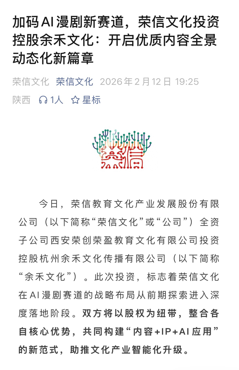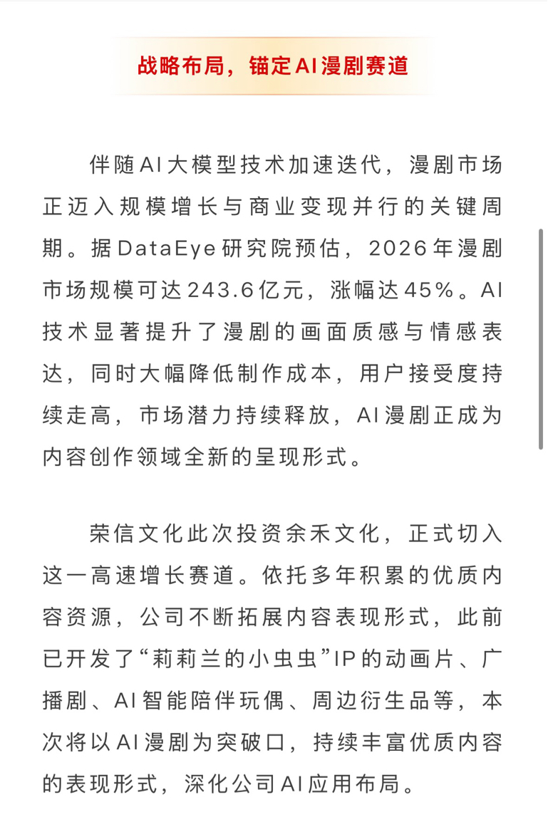重大利好:加码AI漫剧新赛道,荣信文化投资控股余禾文化:开启优质内容全景动态化新