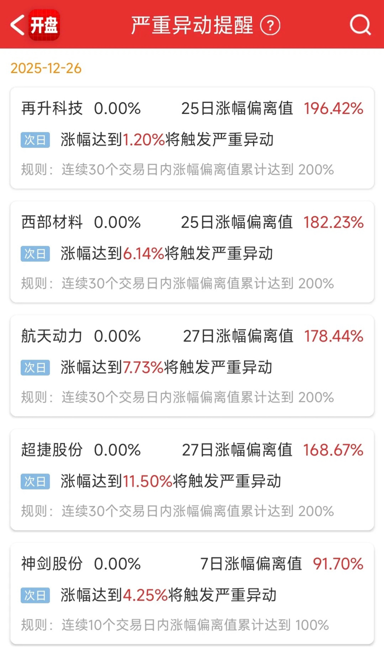 12.26收评:今天龙虎榜量化包场商业航天,游资余哥买了很多,之前天天吹长盈精密,结果跑来买商业航天,下周一很多股都到监管的位置了,看看有没有敢主动进监管的,当然还有一种情况就是不敢进监管,但是想学航天发展,估计也是有难度的,本来情绪票学那种大成交的绕异动几乎很难,像再升科技,下周一只要涨一个点就要进监管,还有这个神剑股份,尤其是神剑,最近只要第1次进监管的,第2天都是大跌,有没有例外不清楚,我就担心他周一搞个天地板,反正我感觉航天周一是比较精彩的,当然后面肯定是有机会的,就是看谁扛跌,今天抗跌的中国卫星也是很多量化,当然也有游资在那里承接。再升科技周一搞不好也有可能会下跌,如果是大跌的话,一般第1天还是不要买,他还有点逻辑嘛,这个神剑股份是完全没有逻辑的,纯情绪。