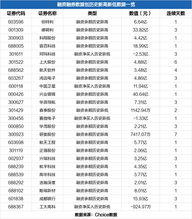 12月31日沪深两市共有103只股票两融数据创历史新高/新低,部分数据如下: