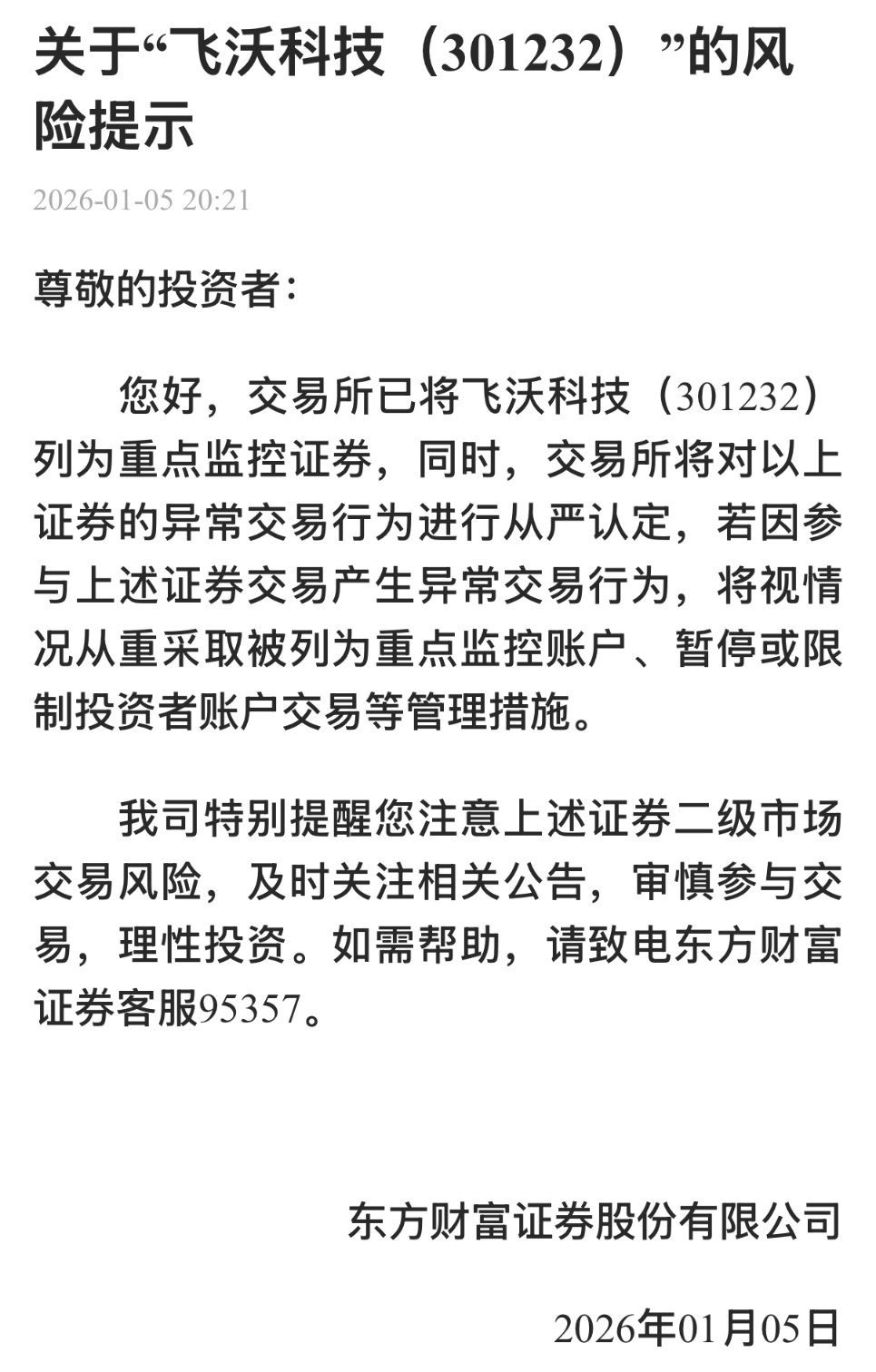 这种明显的预期与现实的“温差”,已引起监管高度关注。东方财富证券1月5日发布风险提示称,“交易所已将飞沃科技列为重点监控证券。同时,交易所将对以上证券的异常交易行为进行从严认定,若因参与上述证券交易产生异常交易行为,将视情况从重采取被列为重点监控账户、暂停或限制投资者账户交易等管理措施。”