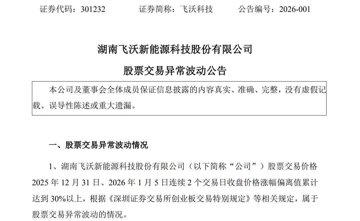 1月5日晚间,湖南飞沃新能源科技股份有限公司(证券简称“飞沃科技”)发布公告称,公司股票交易价格连续两个交易日收盘价格涨幅偏离值累计达到30%以上,属于股票交易异常波动的情况。这已是自2025年12月1日以来,飞沃科技股价累计暴涨超210%后,公司发布的第三份股价异动公告。