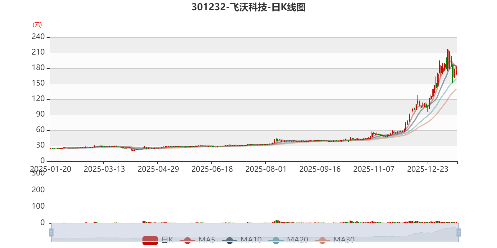 中证智能财讯飞沃科技(301232)1月19日晚间披露2025年度业绩预告,预计2025年实现营业收入25亿元;归母净利润3200万元至4500万元,上年同期亏损1.57亿元;扣非净利润预计3200万元至4500万元,上年同期亏损1.54亿元。以1月19日收盘价计算,飞沃科技目前市盈率(TTM)约为289.63倍-407.29倍,市净率(LF)约9.23倍,市销率(TTM)约5.21倍。
