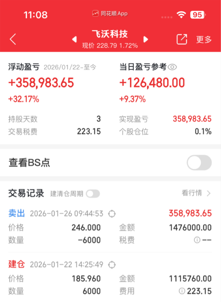 1月22号进的$飞沃科技(SZ301232)$ 今天冲高落袋为安!#强势机会# #股市怎么看# $中国长城(SZ000066)$ $华天科技(SZ002185)$