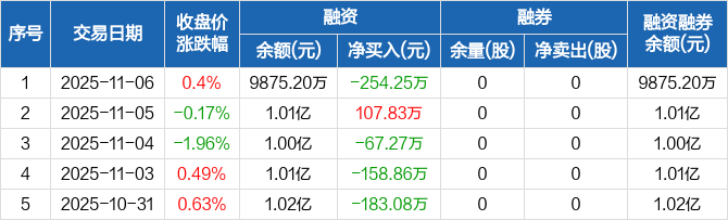 华康洁净:融资净偿还254.25万元,融资余额9875.2万元(11-06)