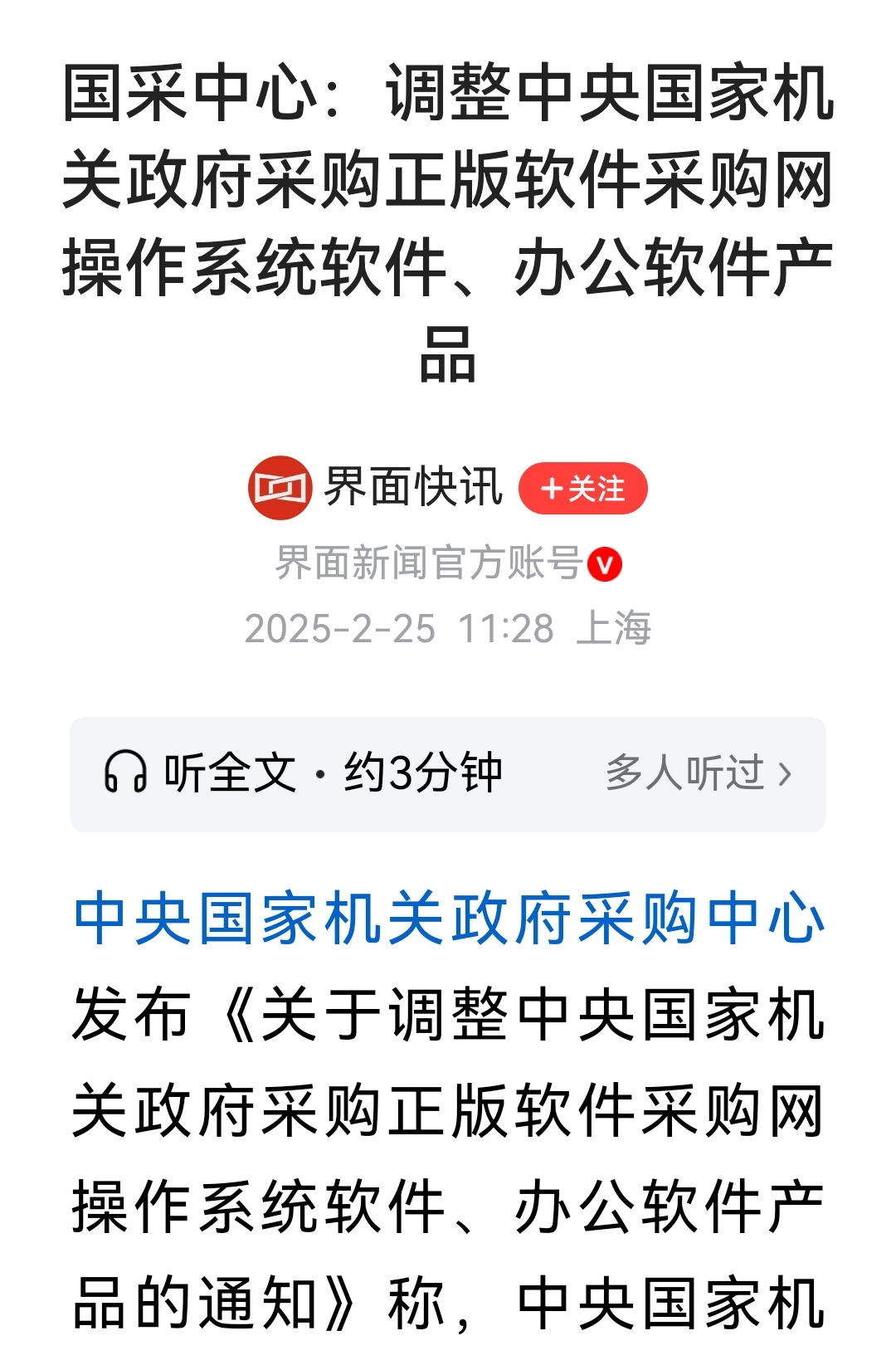 $软通动力(SZ301236)$ 国采中心:调整中央国家机关政府采购正版软件采购网操作系统软件、办公软件产品