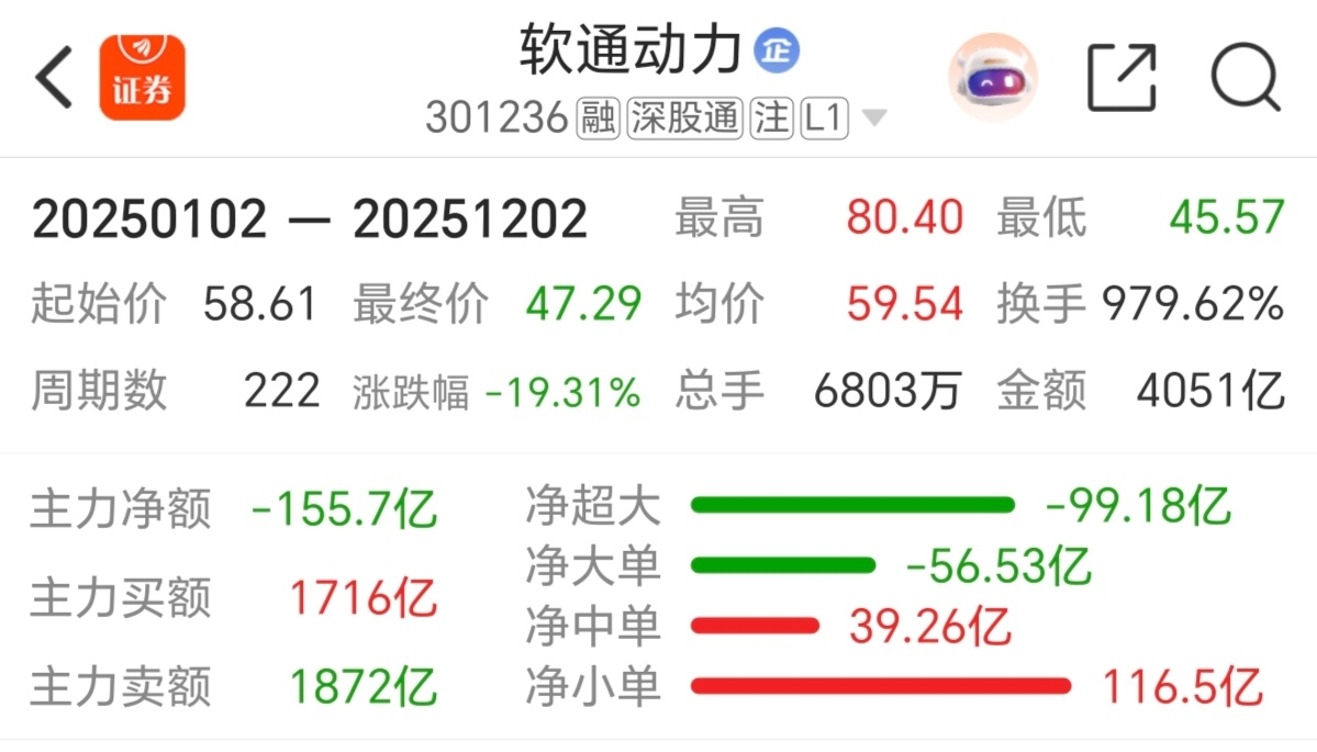 $软通动力(SZ301236)$ 这票今年以来跌了20个点,什么原因也不知道,这么软的票子不知道谁在买谁再卖,谁在赚钱#股市怎么看#
