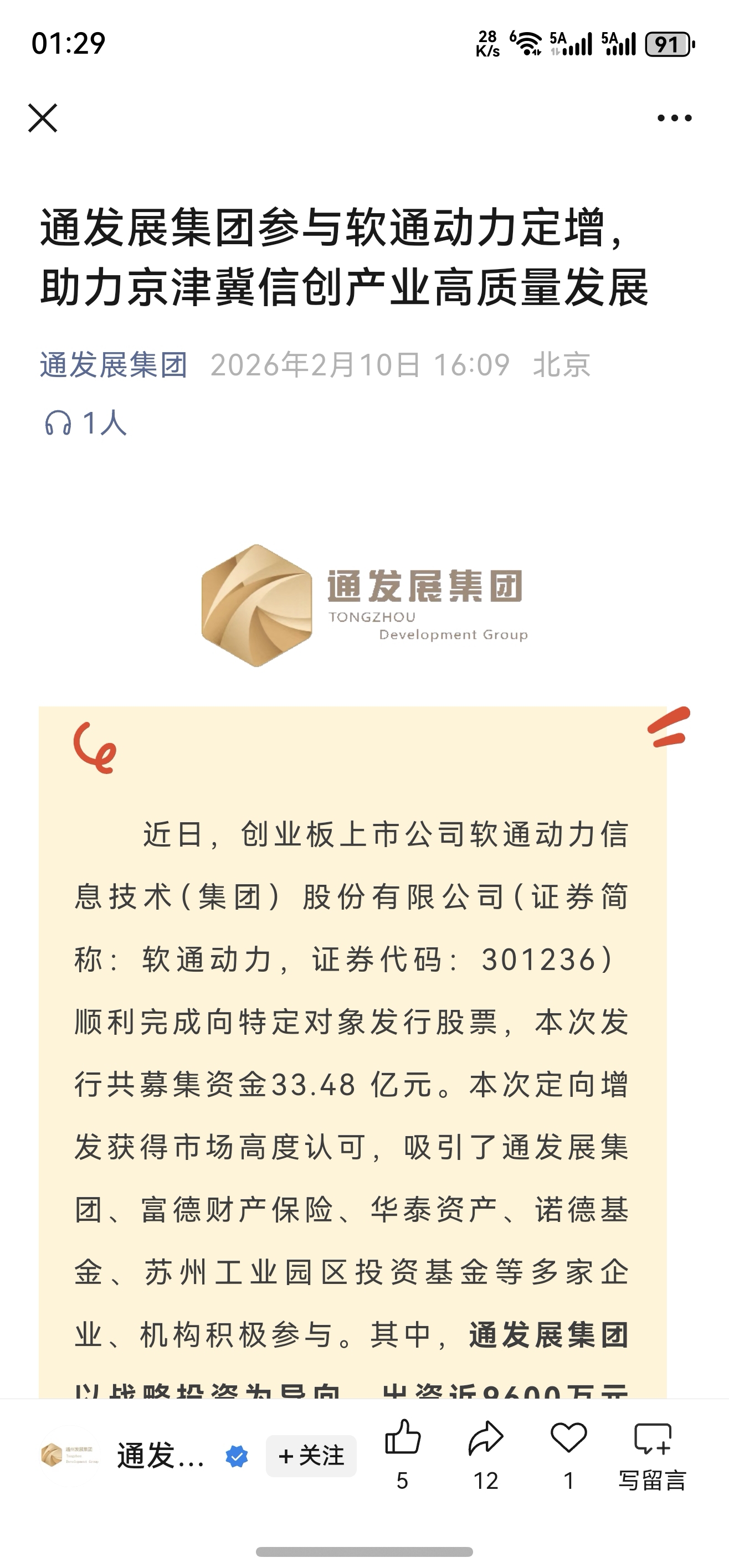 $软通动力(SZ301236)$ 软通动力获得通州官方资金定增支持