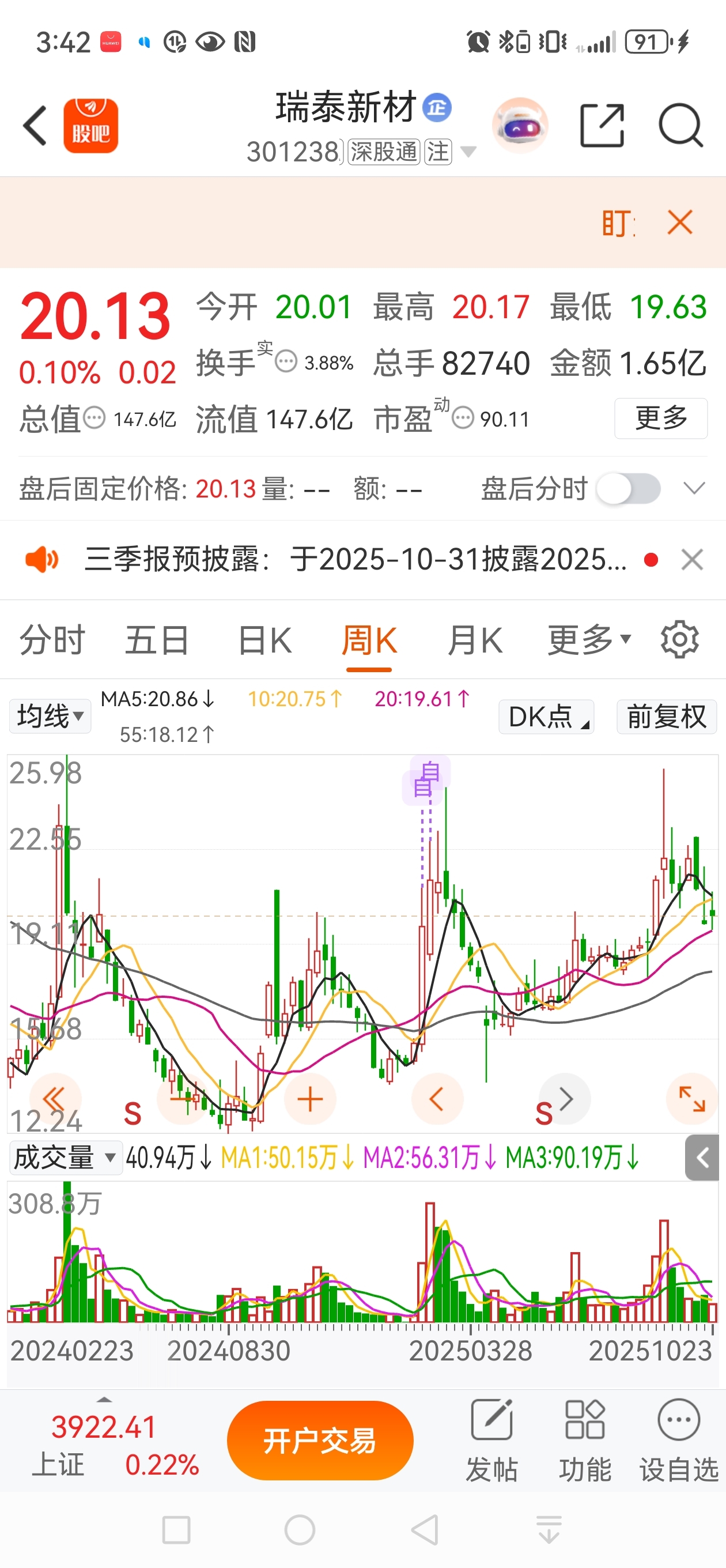 $瑞泰新材(SZ301238)$ 回到20|周线19.6区域夯实基础,下周开始又要震荡上行