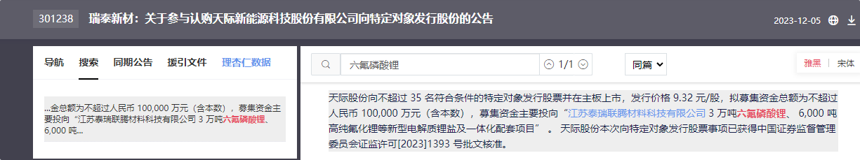 泰瑞联腾是瑞泰新材和天际股份、宁德新能源(ATL)的合资企业,主要生产六氟磷酸锂,一期15000吨,已于去年投产。