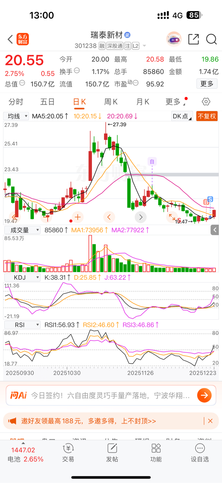 $瑞泰新材(SZ301238)$ 我是哈批,几千块没了!