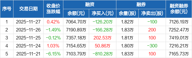普瑞眼科:融资净偿还126.2万元,融资余额7064.7万元(11-27)