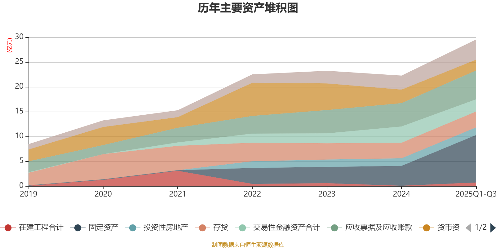 资产重大变化方面,截至2025年三季度末,公司固定资产较上年末增加139.29%,占公司总资产比重上升14.43个百分点;交易性金融资产合计较上年末减少24.57%,占公司总资产比重下降6.36个百分点;货币资金较上年末减少20.06%,占公司总资产比重下降4.87个百分点;存货较上年末增加1.83%,占公司总资产比重下降3.29个百分点。